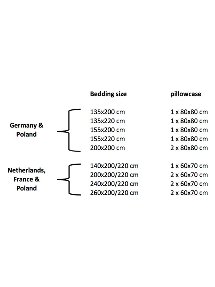 – Bij maat 200 x 200 cm, 200 x 200/220 cm, 240 x 200/220 cm en 260 x 200/220 cm: 1 dekbedovertrek en 2 kussenslopen